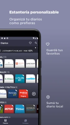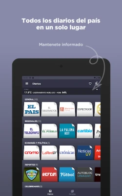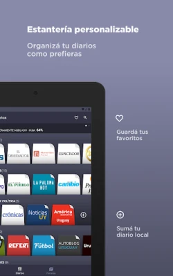 Riippumatta kiinnostuksen kohteistasi, Diarios Uruguayos tarjoaa sinulle sisällön. Talouden ja politiikan ystäville ovat saatavilla Cromo ja LaRed21, kun taas urheilun harrastajat voivat nauttia Ovaciónin ja Referín tarjoamista jännityksen hetkistä. Myös muodin ja julkkismaailman kuumimmat puheenaiheet löytyvät TV Shown, Primicias Yan ja Para Tin kaltaisista medioista, pitäen sinut ajan tasalla trendeistä ja tapahtumista. Kokemuksen parantamiseksi Diarios Uruguayos on saanut useita uusia ominaisuuksia. Voit nyt valita tumman tilan miellyttävämpää lukukokemusta varten, lisätä manuaalisesti sanomalehtiä mihin tahansa hyllyyn ja merkitä suosikkijuttuja myöhempää lukemista varten. Lisäksi voit järjestellä lehtiä ja hyllyjä mieltymystesi mukaan pitämällä niitä painettuna, tai avata artikkelit ulkoisessa selaimessa joustavamman lukemisen mahdollistamiseksi.