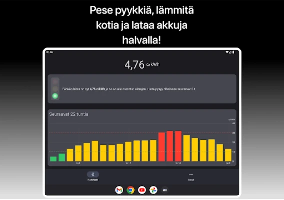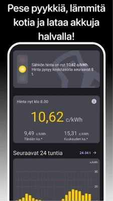 HattiWattin avulla sähköisen päiväsi suunnittelu on vaivatonta. Sovelluksen selkeät "liikennevalot", käyttäjäystävälliset widgetit ja informatiivinen kaavionäkymä auttavat sinua hahmottamaan sähkön tilanteen yhdellä silmäyksellä. Voit nopeasti tunnistaa optimaaliset ajankohdat suurta sähköä kuluttaville toiminnoille ja maksimoida säästöt ilman monimutkaisten asetusten säätämistä. HattiWatt on suunniteltu toimimaan välittömästi, ja oletusasetukset riittävät mainiosti sujuvaan ja tehokkaaseen kokemukseen.