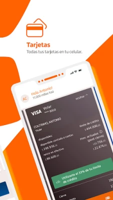 Pidä luottokorttisi hallinnassa kattavilla työkaluilla. Tarkastele luottokorttiesi saldoja ja luottorajoja, sekä selaa tiliotteita helposti. Aktivoi matkustusilmoitukset varmistaaksesi korttiesi toimivuuden ulkomailla ja hae tarvittaessa tilapäistä luottorajan korotusta. Voit suorittaa korttimaksuja suoraan sovelluksen kautta, tarkastella käytettävissä olevaa Visa-luottoasi ja seurata kaikkia Visa-tapahtumiasi. Lisäksi suorita palvelumaksuja kätevästi tai käytä Pagocuentas-palvelua suoraan sovelluksesta. Jos kuulut Volar-ohjelmaan, voit tarkistaa lentomailisaldosi, hyödyntää QR-lunastuksia ja tutustua koko tuotekatalogiin – kaikki yhden, intuitiivisen käyttöliittymän kautta.